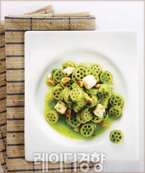 루오테 200g, 잣 1큰술, 페타치즈 적당량, 올리브유 2작은술, 다진 마늘 1작은술, 소금 약간, 페스토소스(바질 20g, 잣 1작은술, 마늘 1톨, 파르메산치즈 1큰술, 올리브유 3큰술, 소금 약간)
