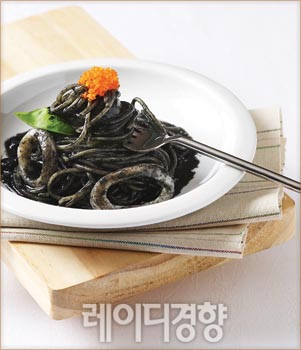 스파게티 150g, 오징어 1마리, 포도씨유 2큰술, 오징어먹물 1작은술, 화이트와인·날치알 1큰술씩, 올리브유·소금·후춧가루 약간씩
