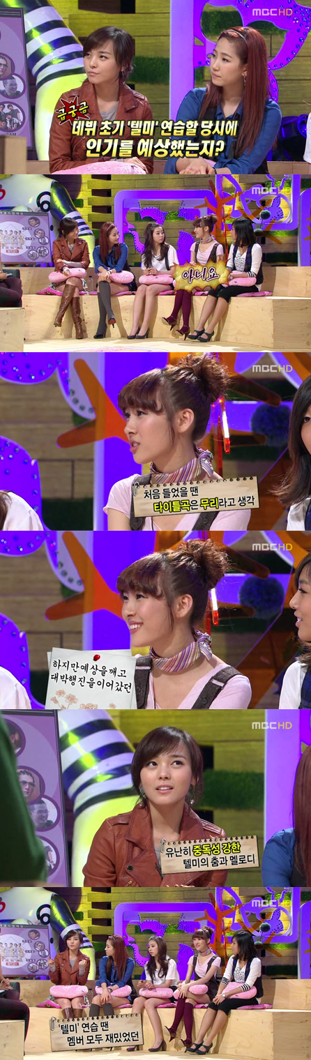 지난 해 대한민국을 강타한 'tell me'열풍의 주인공 원더걸스가 3일 '유재석 김원희의 놀러와'에 출연, 곡에 얽힌 소감을 들려줬다. 원더걸스는 'tell me'가 뜰 걸로 예상했을까. 이날 방송에선 이에 대한 흥미로운 발언이 이어졌다. 멤버 선비는 "tell me가 엄청난 인기를 끌 거라고 생각하지 않았다"고 입을 열었다. 선미는 "대기실에서 처음 들었을 때, 좋긴 좋은데 타이틀 감은 아닌 듯 싶었다"고 밝혔다. 이어 "그런데 그렇게 잘 되니까 되게 기분은 좋은데, 의외였다"는 견해를 밝혔다.