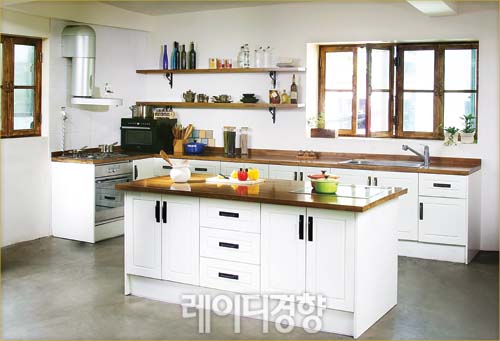 한샘의 키친바흐 500 크림 흐르는 물결을 모티브로 디자인한 아일랜드와 자연 느낌의 원목 식탁을 결합해 편안하고 부드러운 부엌을 연출. 베이지톤 도어는 자연 그대로의 질감을 표현했고, 화이트 도어는 아크릴 신소재로 제작돼 하이글로시의 아름다움이 오랫동안 지속된다. 아일랜드 전체가 터치 오픈 서랍으로 설계돼 적은 힘을 들이고도 보다 편리하게 사용할 수 있으며, 내부 원목 서랍과 오토 조명으로 고급스러움과 편리함을 동시에 느낄 수 있다.