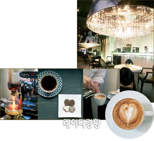 1 블랙과 거대한 샹들리에가 눈길을 사로잡는 고급스러운 카페 내부 2 카페 드 유라에서는 손님의 기호에 맞게 직접 에스프레소를 뽑아준다. 3 깊고 풍부한 맛의 에스프레소와 귀여운 쿠키 4 손님 테이블에서 직접 라테아트를 선보이는 바리스타