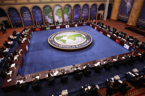 15일 미국 워싱턴 내셔널빌딩뮤지엄에서 G20 국가 정상 과 재무장관들이 글로벌 금융위기 타개 방안을 논의하고 있다. 그동안 세계 경제질서를 좌우한 것은 선진국 모임 인 G7이었지만, 이번 G20 회의에서는 한국을 비롯한 중 국, 브라질, 인도 등 신흥 개도국들이 큰 목소리를 냈다. 로이터연합뉴스