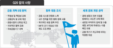 무역 투자 장벽 및 수출 제한 조치를 피하자는 목소리와 국제통화기금(IMF)을 비롯한 국제금융기구에서 신흥 개도국의 경제력을 반영해 대표성을 확대해야 한다는 원칙 등이 공동선언문에 반영된 것은 신흥 개도국들의 영향력 확대를 보여주는 단적인 사례다.