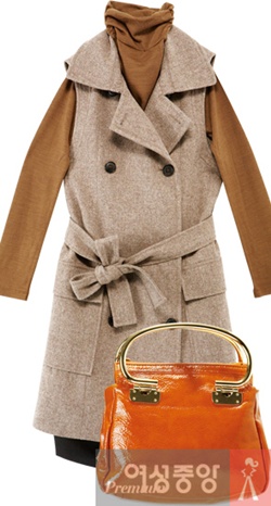 더블 버튼 원피스 형 코트 16만9000원, 민소매 원피스 5만9000원, 브라운 터틀넥 7만9000원, 에나멜 소형 토트백 8만9000원·쿠아