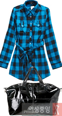 블루 체크무늬 셔츠 2만8800원, 블랙 빅 백4만원대·포에버지