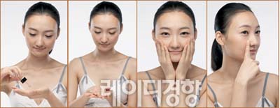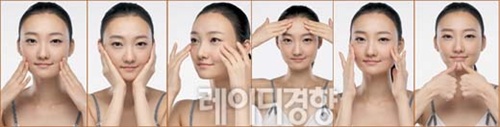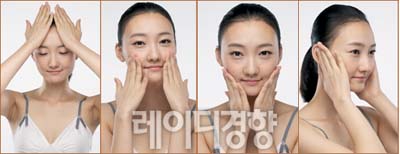 1 페이스 오일을 바르는 기본 과정 다음에 손바닥을 이마로 가져간 뒤 손바닥 전체로 꾹 누른다. 손바닥 끝부분이 눈썹 바로 위에 닿을 정도가 적당하고 양손을 모아 손바닥 전체로 이마를 감싼다. 10초 동안 유지한다. 2 광대뼈 쪽에 손바닥 아랫부분을 대고 눈을 덮고 한 번, 다음으로 양 새끼손가락이 콧방울 옆에 닿게 해 한 번 더 누른다. 10초 동안 유지한다. 3 턱선을 양손으로 감싼 뒤 손가락을 가지런히 모아 손가락 끝부분이 얼굴에서 떨어지지 않게 한다. 10초 동안 유지한 다음 엄지로 턱선을 따라 지그시 누른다. 4 엄지와 검지로 귀를 감싸고 귀 주변을 누른다. 귀는 얼굴의 노폐물이 모이는 곳이기 때문에 마지막에 누를 것. 10초 동안 누른 뒤 마지막으로 귀를 덮고 한 번 더 누르면서 마무리한다. Step 3 탱탱한 얼굴을 만드는 탄력 마사지