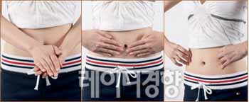 Step 1 납작 배 만드는 복부 마사지 1 손바닥을 비벼 손바닥의 체온을 올린 뒤 보디오일을 적당히 떨어뜨린다. 2 보디오일을 배 전체에 펴 바르고 배꼽을 중심으로 시계 방향으로 20~30회 반복해 둥글게 돌려 마사지한다. 3 배의 군살이 걱정된다면 손바닥과 손가락을 모두 사용해 군살을 움켜쥐고 강하게 주무른다. 최소한 같은 부위를 30초 이상 마사지하고 피부 깊숙한 곳을 자극할 수 있도록 당기듯이 주물러야 더욱 효과적이다. 피부를 세게 마찰하면 지방의 연소를 촉진시켜 효과가 더 좋다.