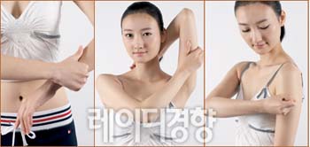 Step 2 군살 없는 매끈한 팔 마사지 1 손바닥을 비벼 체온을 높인 뒤 보디오일을 적당히 떨어뜨린 다음 어깨에서 팔꿈치까지 전체적으로 펴 바른 뒤 손목부터 둥글게 회전하듯 어깨까지 올라가며 마사지한다. 엄지로 팔목부터 팔꿈치까지 꾹꾹 누르며 쓸어 올린다. 2 오른팔을 들어 올려 손으로 왼쪽 목을 잡고 왼쪽 팔로 오른팔의 처지는 팔뚝 살을 꼬집듯이 잡아 비튼 뒤 당긴다. 양손을 바꿔 같은 방법으로 마사지한 다음 팔을 내린 뒤 팔뚝 부위를 반대편 손으로 비틀면서 주무른다. 안쪽에서 바깥쪽으로, 다시 바깥쪽에서 안쪽으로 반복한다. 3 주먹을 살짝 쥐고 다른 팔의 팔목에서 어깨까지 오르내리며 두드린다. 팔을 바꿔 반대쪽 팔도 같은 방법으로 두드린 뒤 팔뚝 살을 반대편으로 손으로 잡고 흔든다.