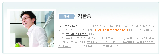 (chef) : 깨우치지 않으면 알 수 없고, 보지 않으면 상상할 수 없습니다. 단순한 이치입니다. 때문에 젊은사람들이 해외로 나가서 많은 것을 보고, 듣고, 익히고 들어온다음 음식을 하게되면 무한한 탄력을 받을 수 있습니다.