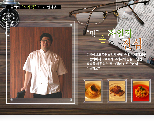 (chef) : 저에게 있어서 “맛”은 자연과 진심입니다. 자연의 식재료를 통해서 진심이 담긴 요리를 만드는 것이 맛이라고 생각합니다. 어렵게 외국에서 공수해서 사용하는 식재료가 아닌, 한국에서도 자연스럽게 구할 수 있는 식재료를 이용하여서 고객에게 요리사의 진심이 담긴 요리를 제공 하는 것 그것이 바로 “맛”이 아닐까요?