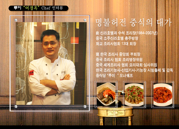 (chef) : 무엇보다도 중식은 대중적입니다. 여기서 말하는 “대중적” 이란 의미는 싸다는 의미가 아닙니다. 남녀노소, 나이를 불문하고 누구나 즐길 수 있는, 모든 대중을 수용할 수 있는 음식이라는 의미입니다. 자장면에서 제비집 요리까지, 단순히 한끼를 때우기 위한 음식부터 접대를 위한 고급음식까지 준비되어 있습니다. 또한 다양한 식재료를 가지고 다양한 조리법으로 요리해 내기 때문에 지금의 중국요리가 탄생되었다고 생각합니다.