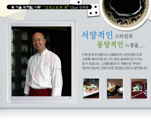 (쿠켄네트) : 안녕하세요? 크리스토퍼 최Chef의 감각적인 스타일은 익히 잘 알고 있습니다. 먼저 W호텔 “나무” 레스토랑을 간략히 설명해 주세요.