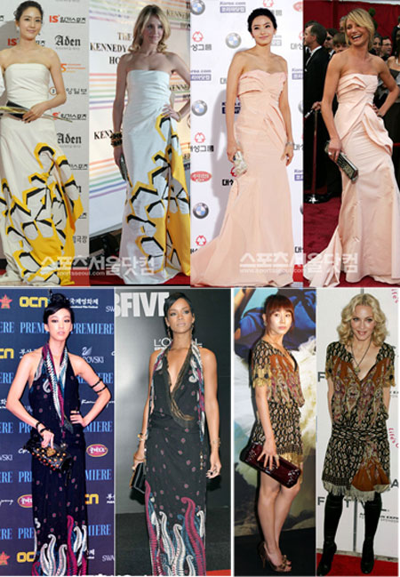 전도연은 지난 5월 제9회 전주국제영화제에서 입고 등장한 드레스는 우연찮게도 제니퍼 가너와 에바 롱고리아가 먼저 입었다. 때문에 전도연은 두 할리우드 스타와 비교되는 불상사를 겪었지만 결코 뒤지지 않는 스타일을 보여줘 팬들을 즐겁게 했다. 팝스타 퍼기는 김아중과 미스코리아 이지선과 같은 드레스를 입어 화제를 모았다. 이밖에도 한-미 패셔니스타로 손꼽히는 정려원-리한나, 박예진-마돈나는 각각 똑같은 보헤미안풍 드레스를 입어 앞선 감각을 과시했다.