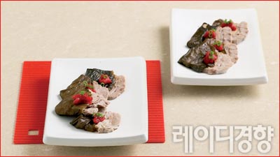 1 삼겹살을 냄비에 담고 고기가 잠길 정도로 물을 넉넉히 부은 뒤 미소된장을 풀어 1시간 정도 푹 삶는다. 2 우메보시는 씨를 빼고 곱게 다진다. 3 고기는 한입 크기로 썰어 깻잎으로 모양을 살려 감싼 뒤 다진 우메보시를 조금씩 얹어 장식한다.