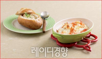 1 냄비에 크램차우더수프와 우유를 넣어 중탕으로 끓여 따뜻하게 데운다. 2 하드 롤은 위쪽에서 2cm 정도를 뚜껑처럼 썬 뒤 속의 빵을 파낸다. 3 속을 파낸 빵 안에 수프를 담고 뚜껑을 살짝 올려 낸다.