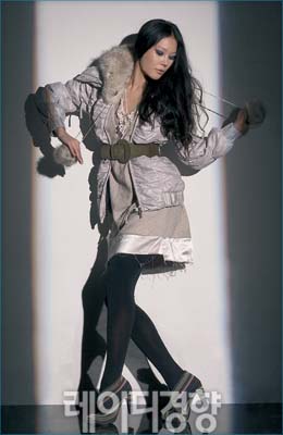 패딩 점퍼 전체에 셔링이 잡힌 실버 패딩 롱 점퍼는 메탈릭한 소재로 퓨처리즘 분위기를 연출할 수 있다. 그레이 원피스와 매치해 모던한 패딩 룩을 완성했다.