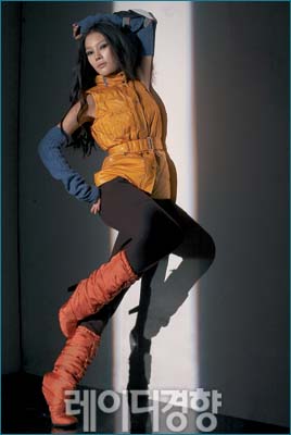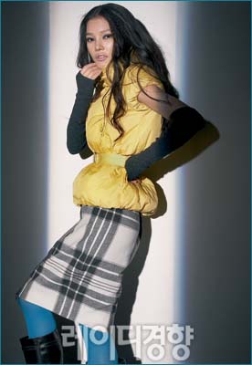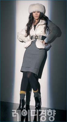 퍼프 소매와 한껏 부풀린 벌룬 디테일의 옐로 패딩 베스트는 롱 워머와 매치해 더욱 시크한 느낌을 연출했다. 하의는 피트되는 실루엣의 스커트와 매치해 슬림하게 연출해볼 것.