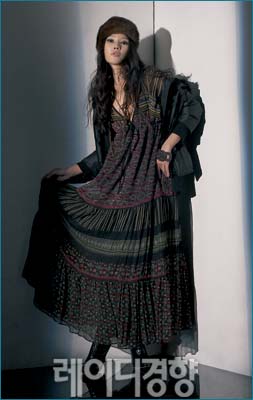 힙선 아래로 내려오는 블랙 패딩은 에스닉한 스타일의 롱 원피스와 매치해 전체적으로 가느다란 실루엣을 연출했다. 여기에 레트로풍 스타일을 더하고 싶다면 다크 브라운 컬러의 밍크 베레모를 더해볼 것.