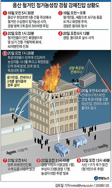 연행자와 관련해선 "마포서 9명, 동작서 10명, 용산서 9명 등 총 28명을 연행해 조사하고 있다"며 "이 가운데 7명이 재개발지역 세입자인 것으로 확인됐고 나머지는 외지인"이라고 밝혔다.