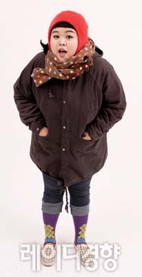 누구나 하나쯤 갖고 있을 법한 겨울용 점퍼. 이런 아이템은 날씬하게 보이려 애쓰는 것보다 지퍼를 다 잠그고 후드까지 뒤집어써 눈사람처럼 동글동글하게 스타일링하면 오히려 더 귀엽다. 대신 컬러풀한 모자나 양말, 신발 등으로 포인트를 준 캐주얼 룩으로 코디네이션할 것. 또 데님 레깅스나 스판 데님 팬츠를 매치하는 등 하의를 헐렁하게 입지 않는 것이 중요하다. 데님 레깅스를 접고 컬러풀한 타이즈가 살짝 보이게 코디하면 상큼하다.