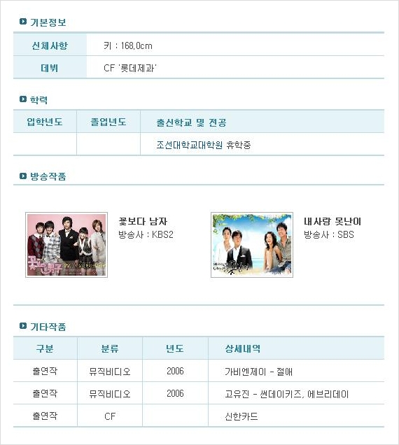 데뷔는 늦었지만 현재 인기리에 방송중인 화제작 '꽃보다 남자'에서 악녀 3인방 중 하나인 써니 역을 맡아 인기몰이를 해왔다.