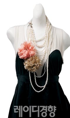 진주 목걸이에 빅 브로치를 달아 전혀 다른 느낌의 목걸이로 변신! 해마다 어김없이 클래식한 용도로 활용해왔던 진주 목걸이를 올 시즌엔 브로치 덕에 조금은 다르게 활용할 수 있을 듯하다. 심플한 디자인의 원피스와 매치하면 스타일리시해 보이고, 캐주얼한 슬리브리스와 매치하면 파티 룩으로도 손색 없다. 진주 목걸이는 기자 소장품. 브로치는 개당 8천원, 동대문 부자재 상가에서 구입.
