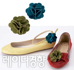 패브릭 브로치+플랫 슈즈 심플한 플랫 슈즈에 패브릭으로 된 플라워 브로치를 달면 로맨틱한 디자인으로 대변신! 의상에 따라 브로치를 붙였다 뗐다 하면, 모던 스타일에서 페미닌한 스타일로 변신이 가능하니 신발 하나로 두 가지 룩을 선보일 수 있어 좋다.