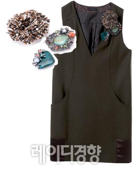 앤티크 브로치+심플 원피스 모임이나 격식 있는 자리 등 스페셜 데이에 꺼내 입게 되는 심플한 디자인의 모직 원피스. 이처럼 독특한 패턴이나 컬러감이 없는 심플한 디자인의 모직 원피스에는 풍성하고 화려한 브로치를 달면 고급스럽고 센스 있는 스타일이 완성된다.