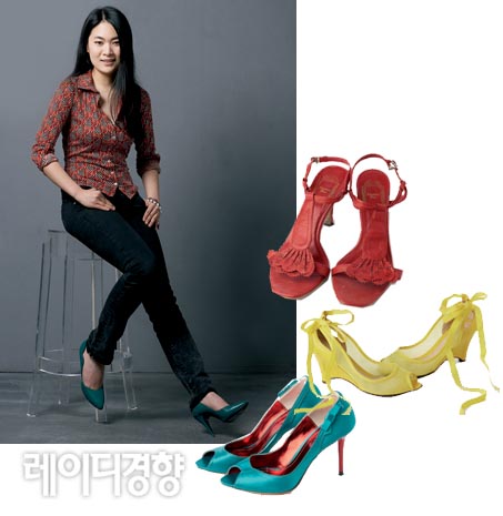 나만의 슈즈 스타일링은? 평소 티셔츠와 진 팬츠를 매치하는 평범한 룩을 즐기기 때문에 슈즈는 컬러를 예민하게 따진다. 모노톤의 심플한 의상에 비비드한 컬러의 슈즈 하나면 단번에 드레스 업 할 수 있기 때문. 특히 하이힐은 특유의 섹시한 느낌을 살려 룩과 잘 매치해야 한다. 개인적으로 화이트 슈즈는 스타일링하기 가장 어려운 컬러.