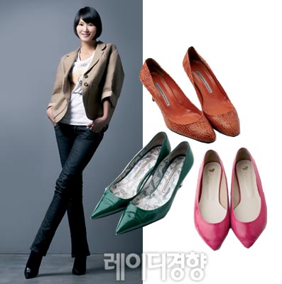 나만의 슈즈 스타일링은? 별다른 치장 없이도 스타일리시해 보이고 싶을 땐 슈즈만 화려하게 연출한다. 심플한 블랙 재킷과 진 팬츠에는 반짝이는 메탈릭 슈즈를 신고 여기에 펑키한 느낌을 주고 싶다면 컬러 스타킹이나 양말을 더한다. 가보시 부분을 부담스럽게 높인 디자인은 단순히 키높이 신발 처럼 보여 피하고, 웨지 힐도 둔탁하고 섹시하지 않아 싫어한다.