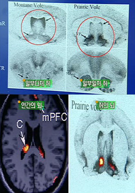 연구팀은 불스와 일부다처제인 다른 들쥐의 뇌를 비교 연구했다. 단층 촬영 분석 결과 불스는 뇌의 아래쪽이, 일반 들쥐는 위쪽에서 호르몬이 활성화되면서 검게 변했다. 검게 변한 부분은 코카인이 반응하고 헤로인이 중독성을 유발하는 부분과 같은 부위. 결국 불스가 일부일처를 유지하는 이유는 일종의 중독이라는 게 박사의 설명.
