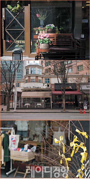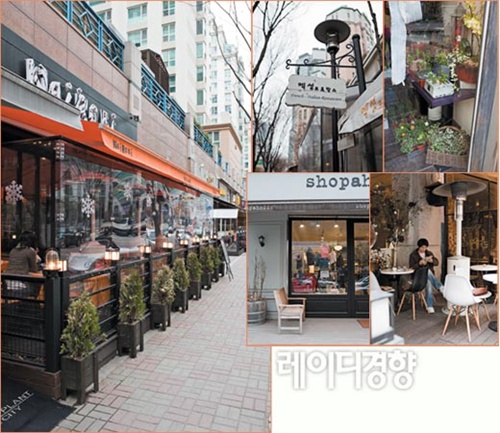 성남시 분당구 정자동의 주상 복합 아파트 숲. 하늘 높게 솟아 있는 빌딩들 사이로 유럽풍의 노천카페가 펼쳐진다. 정자동 카페 거리다. 2005년 파라곤과 상떼뷰리젠시가 마주하며 1층 상가에 하나 둘 카페와 레스토랑이 들어서기 시작하더니 곧이어 제과점과 아이스크림 가게, 로드숍 등 40~50개의 업소가 자리를 잡았다. 이곳의 가장 큰 특징은 테라스다. 업소마다 각양각색의 테라스를 만들어 한국에서는 흔히 볼 수 없는 아기자기하고 이국적인 분위기를 연출한다. '정자동 유럽풍 거리'라는 별명은 이런 이유로 얻어졌다. 이곳이 강남의 여느 카페들보다 좋은 건 바로 붐비지 않는 여유로움에 있다.