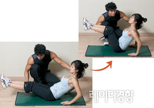 무릎을 살짝 구부리고 팔로 몸 뒤쪽을 짚어 몸을 V자 형태로 만듭니다. 다리와 상체를 동시에 멀어지게 만들었다가 배에 긴장을 유지하면서 동시에 모아줍니다. 고개는 살짝 들어 위를 바라본다는 느낌을 유지하고, 복부와 허리 근육을 둥글게 만드는 동작입니다. 팔로 몸무게를 지탱하면 운동이 되지 않습니다. 이 동작이 익숙해지고 근력이 생기면 손을 바닥에서 떼고도 정확하게 할 수 있어야 합니다. 몸을 많이 움직이는 것을 목표로 하지 말고 적게 움직이더라도 팔의 힘이 아닌 배의 힘으로 동작을 진행하며 상체와 하체가 동시에 내려가고 올라가도록 움직입니다. < < 옆구리 운동