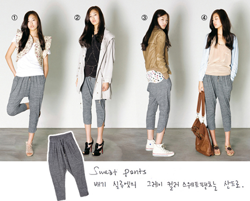 ● Fashionista style study_스웨트팬츠(왼쪽부터) ① 실루엣이 독특한 베스트와의 매치. 어깨를 강조한 플라워 프린트 베스트는 이자벨마랑, 심플한 화이트 티셔츠는 베이직+, 레이스업 샌들은 띠어리. ② 오버사이즈 점퍼를 매치한 루스 실루엣. 베이지 컬러 점퍼는 에린 브리니에, 에스닉한 스터드 디테일의 홀터넥 톱은 쉐리바델 by 사바티에, 하이브리드 슈즈는 나무하나. ③ 블루종으로 연출한 보이시 스타일. 캐멀 컬러 레더 블루종은 자딕앤볼테르, 올빼미 프린트 슬리브리스는 쟈뎅 드 슈에뜨, 하이톱 스니커즈는 컨버스. ④ 베이식 아이템의 심플한 조합. 스카이 블루 컬러 카디건은 유니클로, 루스한 실크 소재 슬리브리스는 토크/서비스, 에스닉한 통은 다이안 본 퍼스텐버그, 숄더백은 산드로.