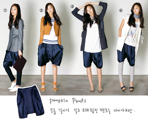 ● Fashionista style study_펌킨 팬츠(왼쪽부터) ① 테일러드 재킷과 브리프케이스로 연출한 앤드로지너스 룩. 그레이 컬러의 더블 버튼 재킷은 베이직+, 데님 소재 레깅스는 데코, 화이트 레이스업 슈즈는쿠아, 와인 컬러 브리프케이스는 토크/서비스.