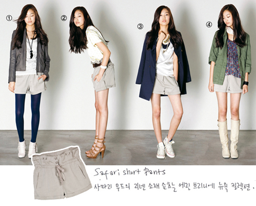 ● Fashionista style study_사파리 쇼트팬츠(왼쪽부터) ① 짧은 블루종이 연출하는 경쾌한 무드. 오가닉 레더 블루종은 꼼뜨와 데 꼬또니에, 그레이 슬리브리스는 96ny, 프린지가 달린 부티는 르샵.