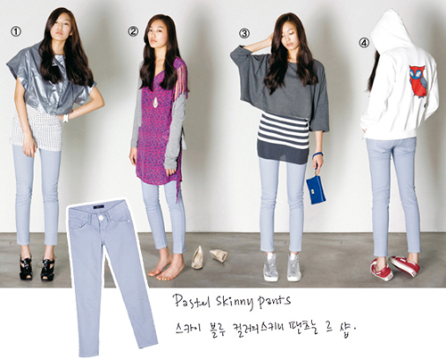 ● Fashionista style study_ 파스텔 스키니 팬츠 (왼쪽부터) ① 어깨를 강조한 점퍼로 연출한 1980년대 실루엣. 실버 컬러 미니 점퍼는 카이아크만, 별 프린트 슬리브리스는 베이직+, 하이브리드 슈즈는 나무하나, 뱅글처럼 보이는 시계는 마크 바이 마크 제이콥스 by 포실(코리아).