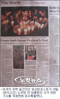 워싱턴포스트(WP)도 이날 노 전 대통령의 서거를 애도하며 추모객이 촛불을 밝히고 있는 사진을 국제면에 크게 싣고 빈농의 가정에서 태어나 최고 권력에 오르기까지의 노 전 대통령의 정치적 역정과 재임 기간의 공과(功過)를 상세히 소개했다.