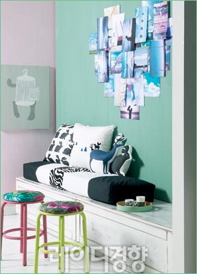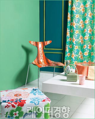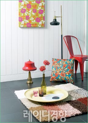 이국적인 플라워 패턴과 생동감 있는 스트라이프 패턴으로 봄기운이 넘쳐나는 공간을 만든다. 플라워 패턴 패브릭과 의자에 디자인 테이프로 만든 스트라이프 패턴 모두 비비드한 컬러감을 맞춘 것이 매치 기술이다. 옐로 홀로그램 벽시계·스툴 커버링 패브릭 호사컴퍼니. 화이트 테이블 가격미정, 스타일K. 나머지는 스타일리스트 소장품.