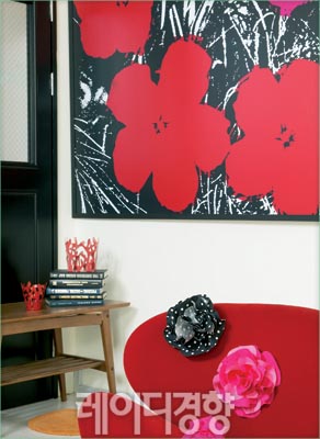 같은 플라워 패턴이라는 큰 카테고리 안에 서로 다른 스타일을 믹스해본다. 크고 대담한 플라워의 팝아트 액자 그리고 여기에 대비되는 복고풍 터치의 플라워 코르사주를 대비시켜 스타일링의 재미를 느껴본다. 레드 스테인리스 스틸 오브제 가격미정, 한룩스. 팝아트 액자·플라워 코르사주 스타일리스트 제작품. 레드 의자 스타일리스트 소장품.