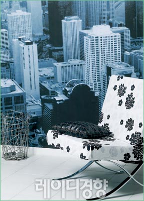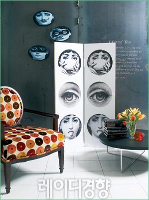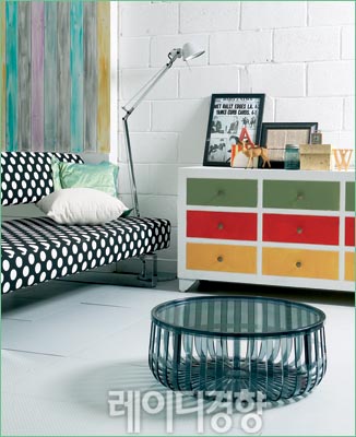 도트 패턴과 스트라이프 패턴이 만나 리드미컬한 공간을 연출한다. 도트나 스트라이프가 가진 느낌 모두 자칫 산만해 보일 수 있으니 모노톤 컬러와 비비드 컬러의 적절한 조화가 필요하다. 블랙 & 화이트 도트 패브릭 소파 가격미정, 스타일K. 빈티지 플로어 스탠드 가격미정, 두닷. 아크릴 테이블 가격미정, 제인인터내셔널. 빈티지 우드 박스 라 매뉴팩춰.