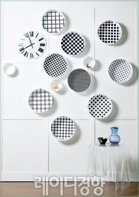 일정한 패턴의 반복인 옵티컬 패턴과 도트 패턴의 이색적인 믹스로 꾸민 월 데코. 아크릴을 커팅해 만든 원형 선반과 그 안쪽에 각기 다른 옵티컬 패턴으로 포인트를 준다. 비슷한 크기의 벽시계도 함께 데코해 위트를 더한다. 블루 화병·블랙 볼 가격미정, 호사컴퍼니. 나머지 스타일리스트 소장품.