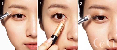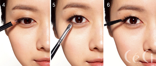 "눈을 크게 보이도록 라인을 두껍게 그리거나 라인을 눈꼬리 쪽으로 많이 빼면 자칫 단점을 도드라지게 하는 역효과가 날 수 있어요. 특히 작고 얇은 속쌍꺼풀 눈은 진한 색조나 라인이 더더욱 부담스럽게 느껴지죠. 이런 경우엔 속눈썹에 포인트를 주는데, 뷰러로 한 번, 마스카라로 두 번 제대로 높이 올리세요. 속눈썹 결을 살려 최대한 가닥가닥 뭉치지 않게 마스카라를 바르는 것도 필수 사항이죠."