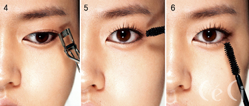 6 뷰러로 속눈썹을 최대한 올리고 마스카라를 여러 번 덧발라 깊이 있는 눈매를 완성한다.
