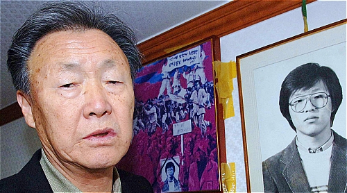사진은 부산 사하구 괴정동 자택에서 아들의 사진 앞에서 눈물을 삼키고 있는 박정기씨 故박종철씨의 부친 박정기(78)씨.