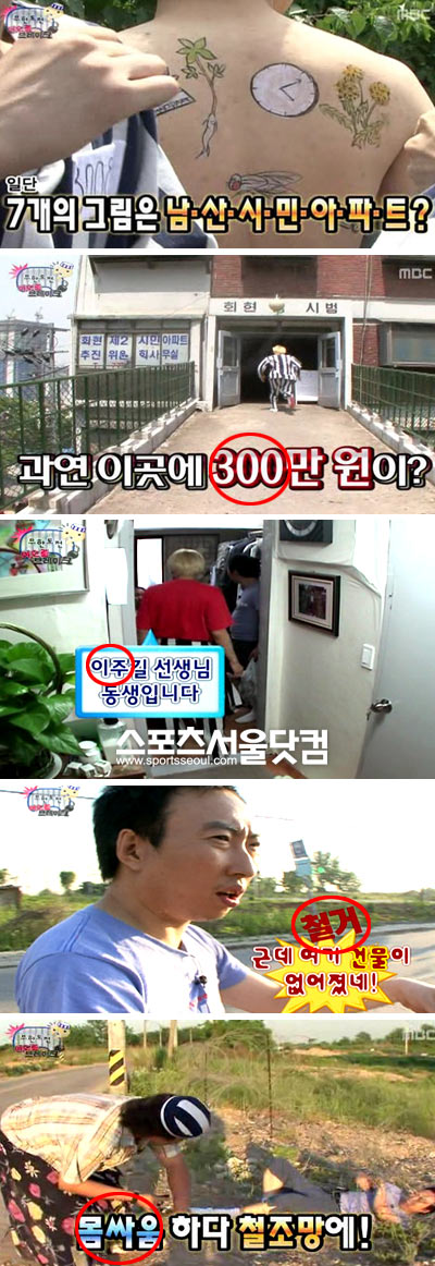 김 PD의 이런 문제 의식은 자막 속에서도 드러난다. '석호필'을 패러디한 문신에서 '남산시민아파트'를 설명하고 있으며, 제 8의 멤버 길의 이름을 '이주길'로 정했다. 재개발과 세입자 이주를 뜻하는 것이다. 게다가 300만원이 숨겨진 오쇠동 현장에서는 '철거'와 '몸싸움' 등의 자막을 삽입했다.