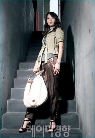 2 Safari Look 내추럴한 글리터링 느낌이 멋스러운 배기팬츠와 카키색 셔츠형 아우터를 매치해 사파리 룩을 연출했다. 도회적인 느낌의 새틴 팬츠와 밀리터리풍 상의가 더해져 더욱 강한 인상을 남긴다. .