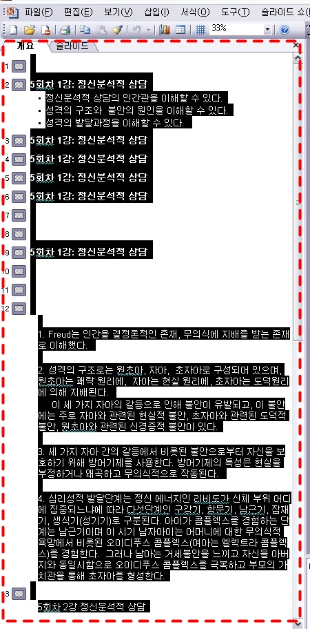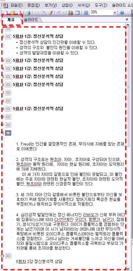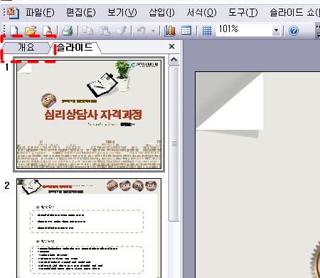 1. ppt 교안자료를 열어보세요...^^ 그러면 좌측상단에 개요 and 슬라이드 가 보이시죠...^^