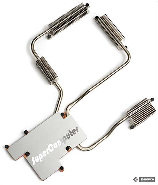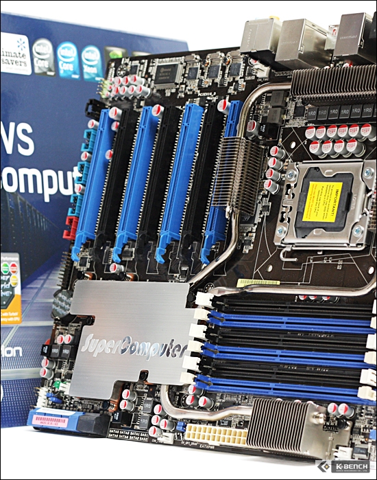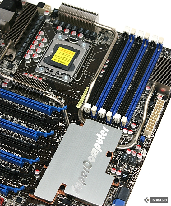 Fanless Heat-pipe Design, 이것은 ASUS P6T7 WS SuperComputer에서 찾아볼 수 있는 특징 중 하나이다. 큼직한 방열판과 히트파이프를 통해 굳이 시끄럽게 쿨링팬을 돌리지 않아도 전원부는 물론 2개의 NF200칩셋 그리고 ICH/MCH 칩셋까지 식혀주는 구조를 갖추고 있다. SuperComputer라고 각인되어 있는 큼직한 방열판이 NF200과 ICH/MCH를 식히는 부분이다.