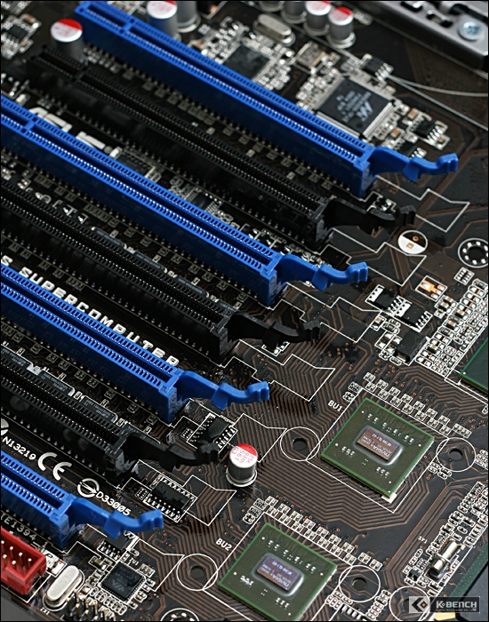 PCI-Express 2.0 딱 7개만, ASUS P6T7 WS SuperComputer메인보드에는 PCI-Ex 2.0 외에 다른 슬롯은 전혀 준비되어 있지 않다. 총 7개의 슬롯 중 파란색의 넷은 NF200을 통해 확장한 16레인 슬롯이며, 검은색의 3개 슬롯은 스위칭 로직을 사용해 각각 8배속을 지원하게 만들었다. 이렇게 해서 풀 사이즈 규격의 PCI-Express 슬롯을 모두 7개나 마련했고, SLI 및 CrossFire X를 지원한다. 물론, SLI의 경우는 쿼드 SLI는 듀얼 GPU 카드를 SLI로 묶는 경우만 해당되고 싱글 GPU카드의 경우에는 트리플 SLI까지만 구성할 수 있으므로 '각 슬롯에 GTX285를 끼워 쿼드!' 같은 것은 불가능하다. 하지만 SLI를 구성하지 않더라도 여러 장의 그래픽 카드에 의한 멀티 모니터 시스템 구축 같은 경우에 보다 유연성이 있음은 분명해보인다.